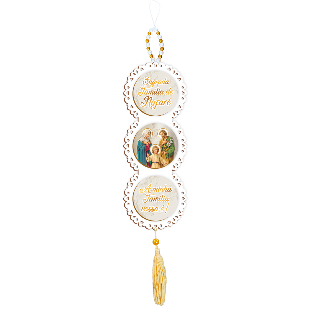 Os adornos triplos da Bella Arte são confeccionados em MDF branco com a imagem adesivada. Acabamento de borla e a pérola. Ideal para pendurar na parede da sua casa ou presentear um familiar.