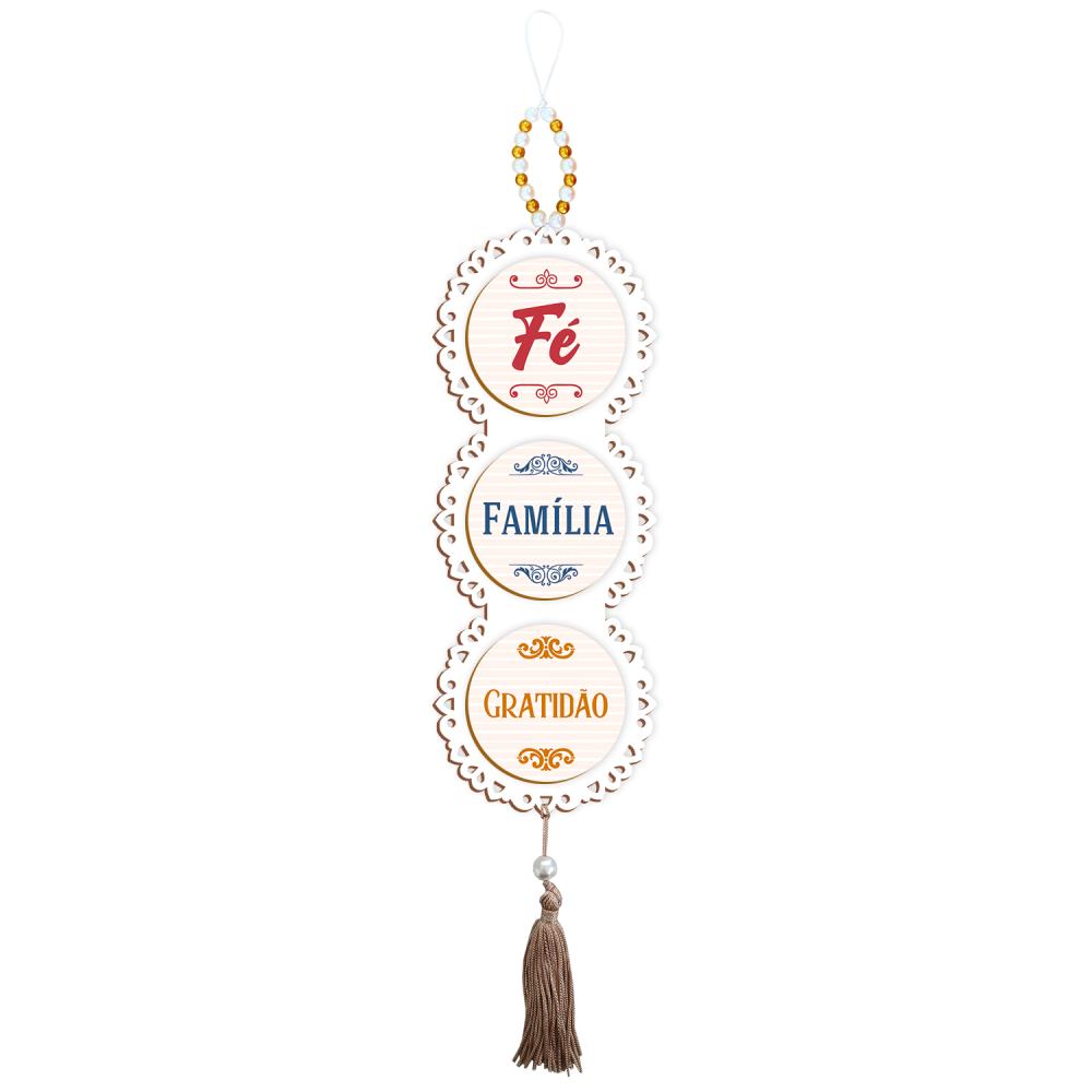 Os adornos triplos da Bella Arte são confeccionados em MDF branco com a imagem adesivada. Acabamento de borla e a pérola. Ideal para pendurar na parede da sua casa ou presentear um familiar.