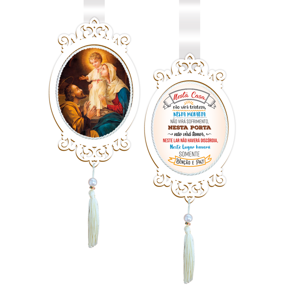 O Escapulário de Porta ou Adorno de Porta da Bella Arte é confeccionado em MDF branco 3mm e possui imagem da Sagrada Família.