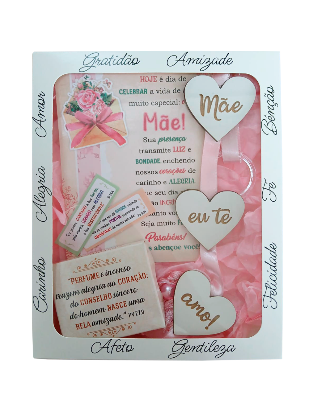 Acompanha Caixa, Postal de Mães (aleatório, sem opção de escolha), Adorno de Mãe e preciosas promessas.