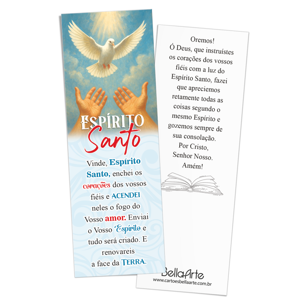 O Kit com 50 Marca Páginas possui acabamento em verniz e glitter. Na parte frontal temos a imagem do Espírito Santo e no verso a oração.