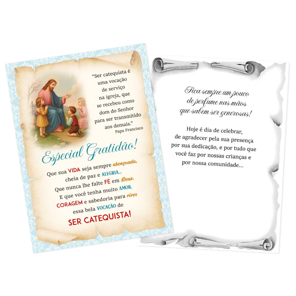 Os Postais religiosos são feitos em papel triplex e possuem acabmanetos em verniz e glitter. É uma ótima opção para presentear um familiar ou um amigo.